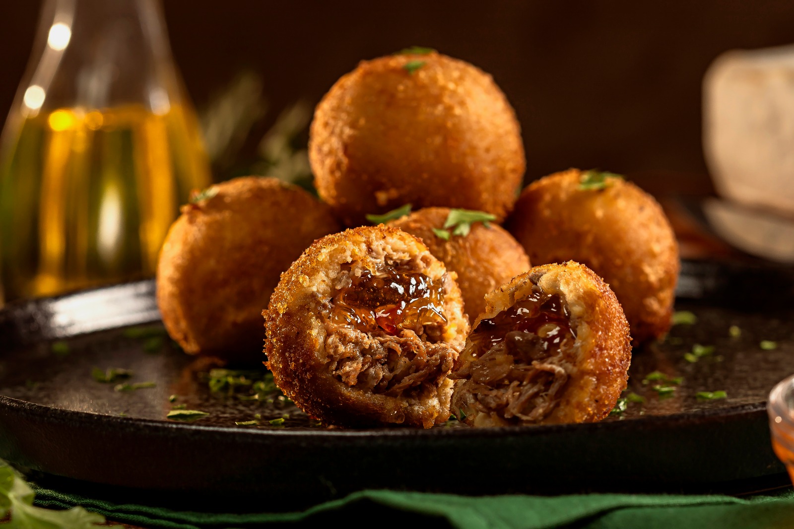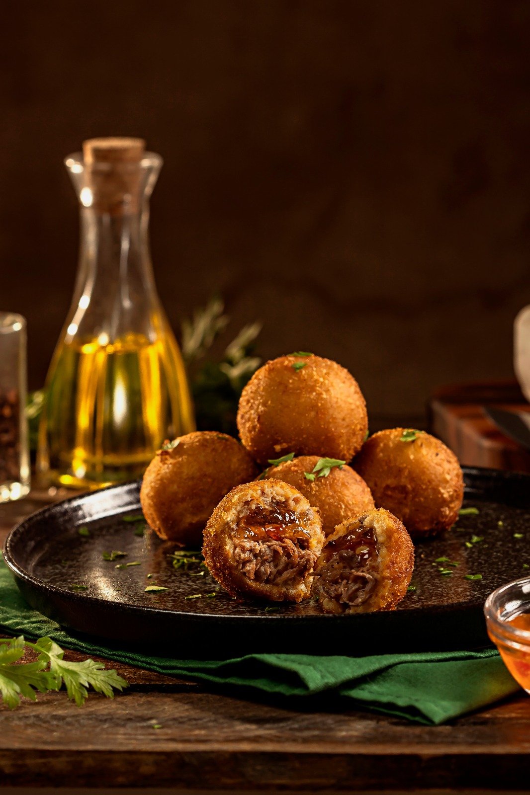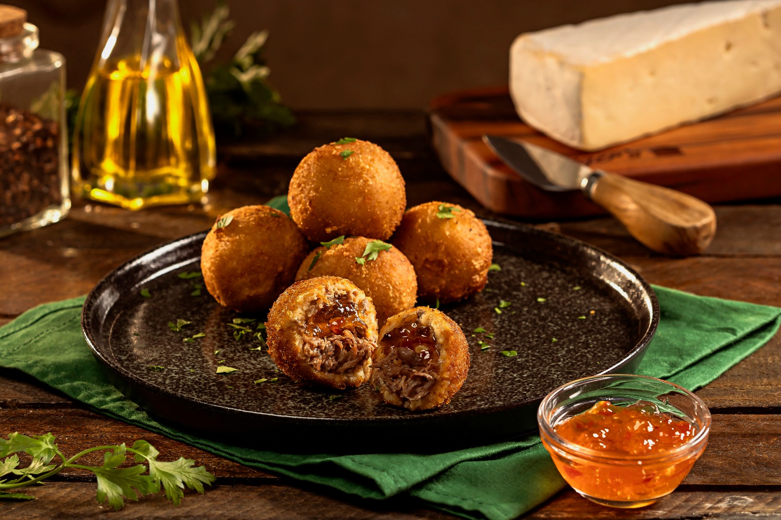 INGREDIENTES: Carne Bovina, cebola, alho, azeite, farinha de trigo, pimenta branca, ovos, pimenta vermelha e queijo brie.