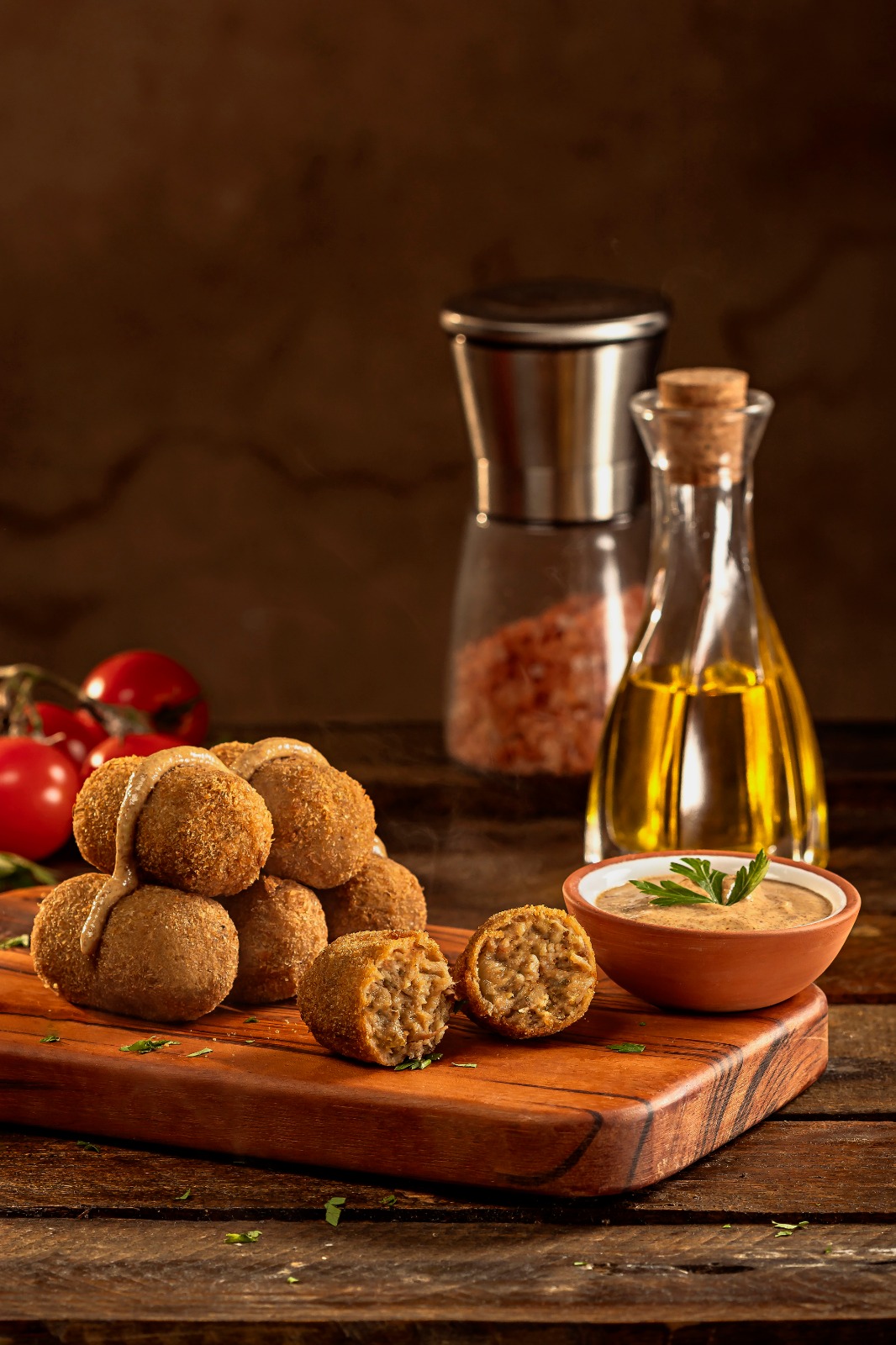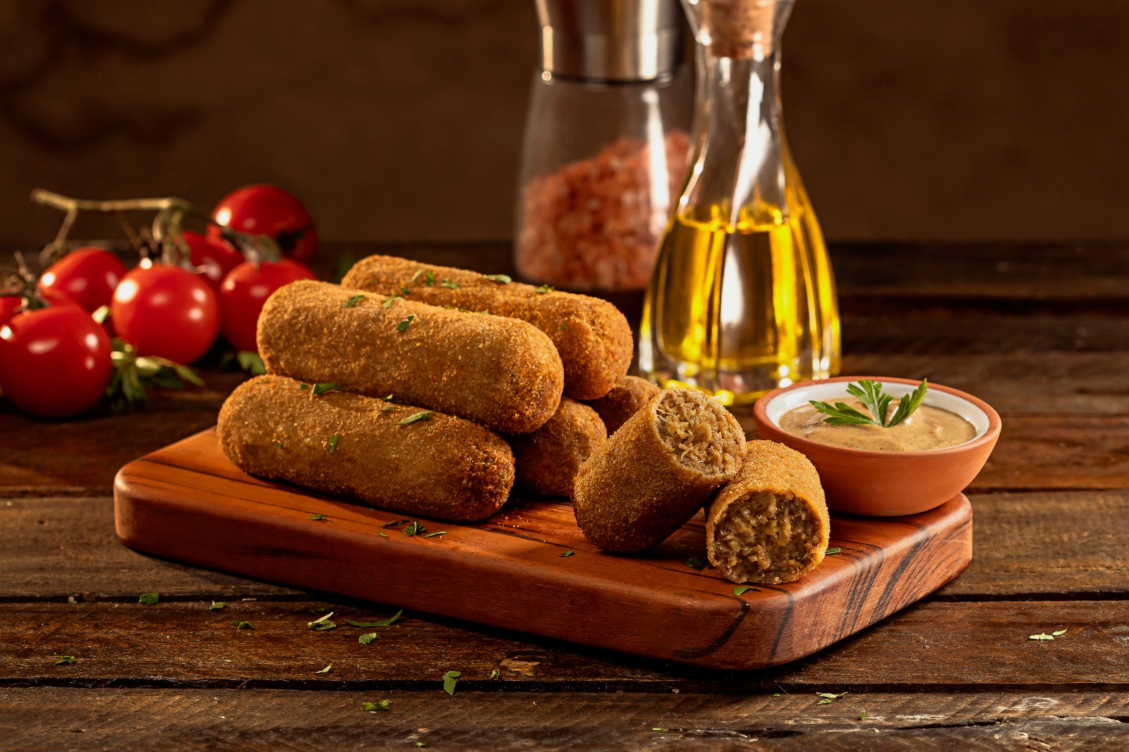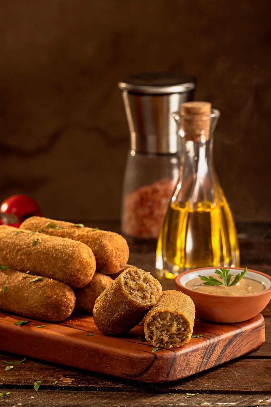 INGREDIENTES: Carne Bovina, cebola, alho, azeite, farinha de trigo, pimenta branca, ovos e pimenta branca.